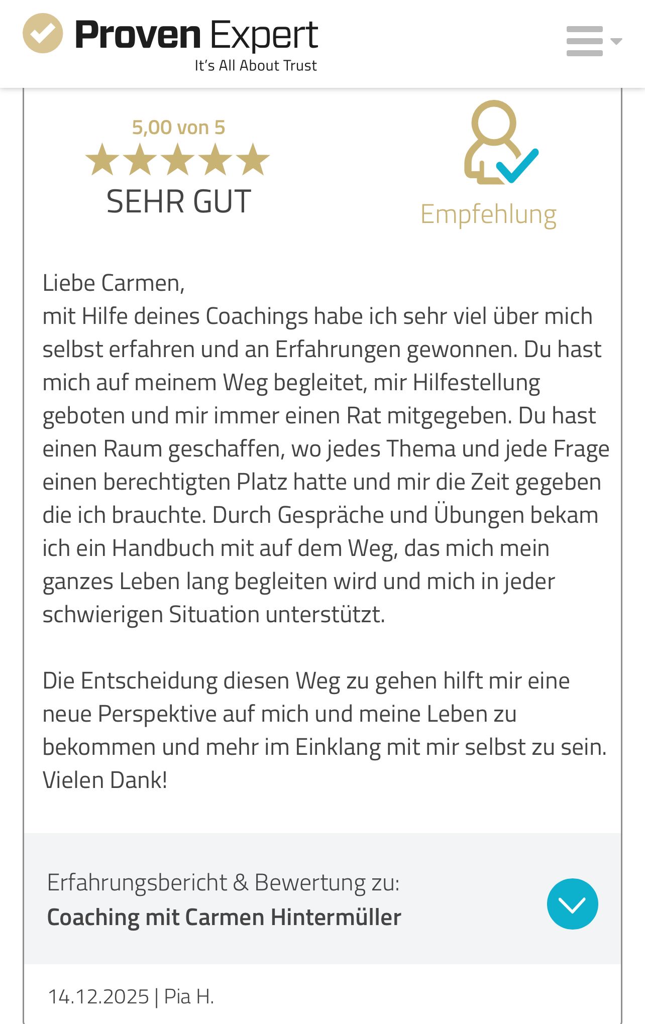 Feedback zu Coaching inneren Frieden erleben